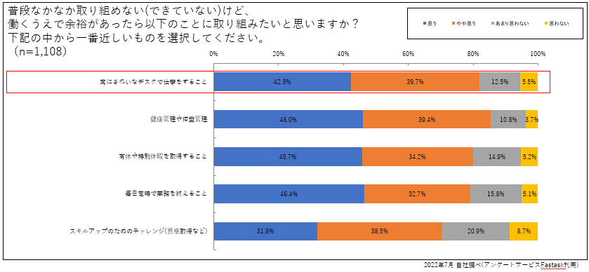 景品パークでは、20代〜50代男女の会社員を対象に「働く上で余裕があったら常にきれいなデスクで仕事をしたいと思いますか?」というアンケートを実施しました。その結果、全体の82%が「取り組みたいと思う(やや思う)」と考えていることが分かりました。
