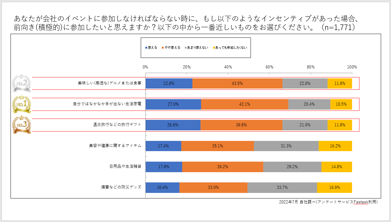 この結果から、「自分では購入しないが、もらったら嬉しい」という景品が喜ばれることが分かりますね!社内イベント実施の際は、時短につながる便利な家電や、ちょっと高級なお取り寄せグルメなど、従業員の誰もが喜ぶような景品を用意しておきましょう!