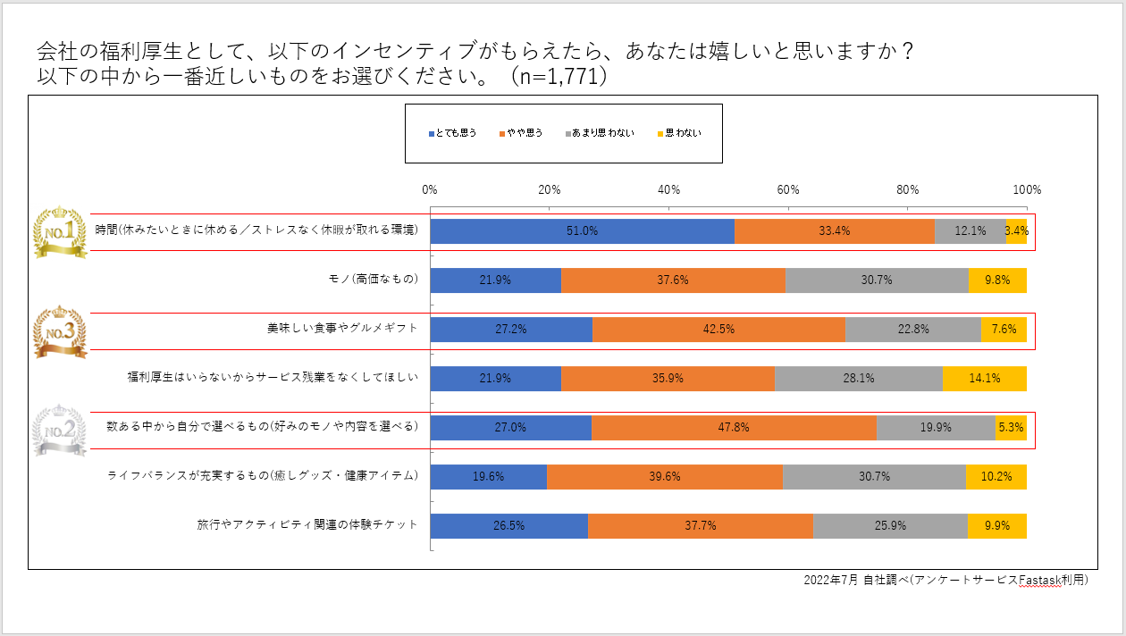 『景品パーク』でおこなったアンケート調査では、福利厚生で嬉しいものとして「好きなものや内容が選べるもの」や「美味しい食事やグルメギフト」が上位となりました。