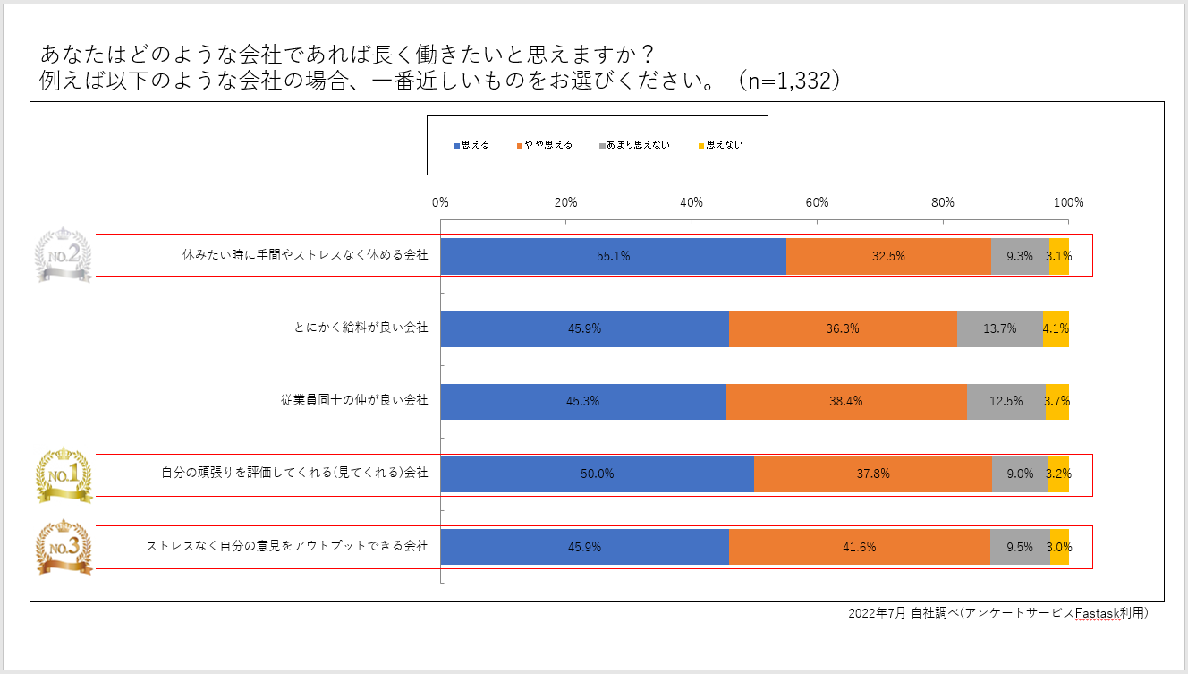 つまり、離職率を下げるポイントは「職場の人間関係」といえるのではないでしょうか。ここに注目した『景品パーク』では離職率を下げるヒントを深堀すべく独自調査を実施!20~40代までの会社員を対象とし「あなたはどのような会社であれば長く働きたいと思えますか?」というアンケートを実施しました。1,332人の会社員を対象に実施して驚いたのは「とにかく給料が良い会社」に「思える(やや思える)」と答えた人が一番少なかったこと。結果は下記のとおりでした。